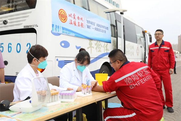 活动现场还开启了“暖航——船员公益体检项目”,流动体检车停靠在烟台港,为海员们提供血压、心肺功能等专项检查。与此同时,慰问组深入“中华复兴”轮船员舱室,实地了解船员工作、生活情况,为船员们送上矿泉水、洗漱包等生活物资。