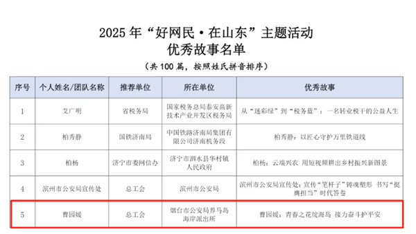 近日,第五届山东网络文明周启动仪式上,揭晓了2025年“好网民·在山东”主题活动优秀故事获奖名单。由烟台市总工会上报的《曹园媛:青春之花绽海岛 接力奋斗护平安》,经山东省总工会推荐,成功入选2025年“好网民·在山东”主题活动优秀故事。